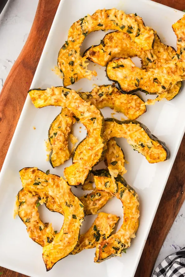 Air fryer acorn squash slices get a savory boost with thyme and parmesan cheese.
