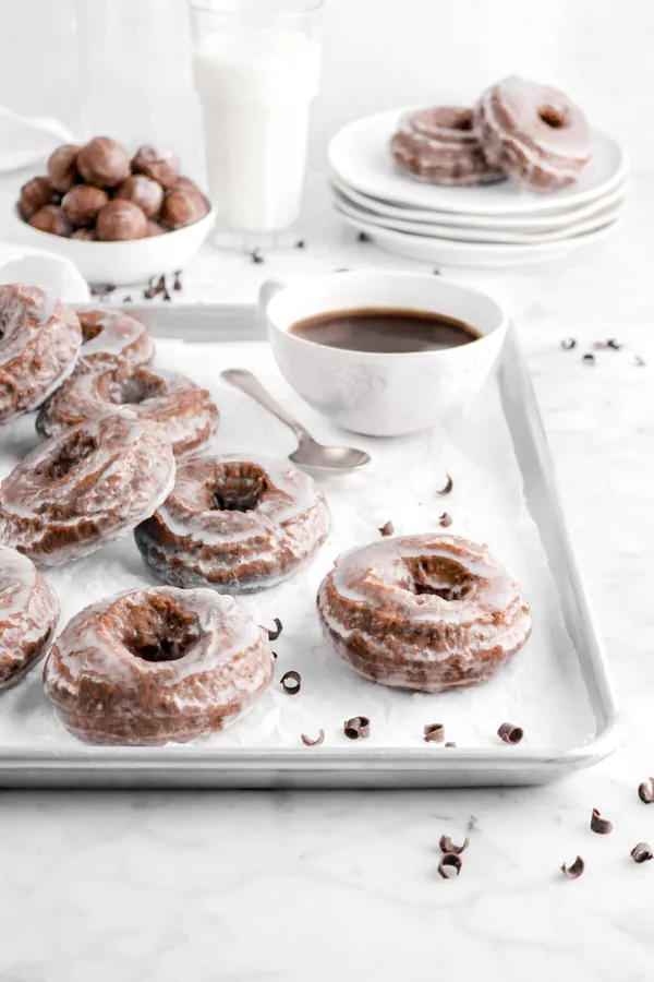Old Fashioned Chocolate Doughnuts with Vanilla Glaze are soft, fluffy, and rich with chocolate.