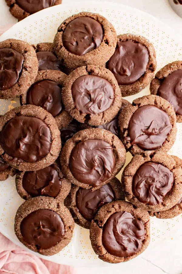 Chocolate Thumbprint Cookies feature a smooth chocolate center nestled in a soft, slightly sweet cookie base.