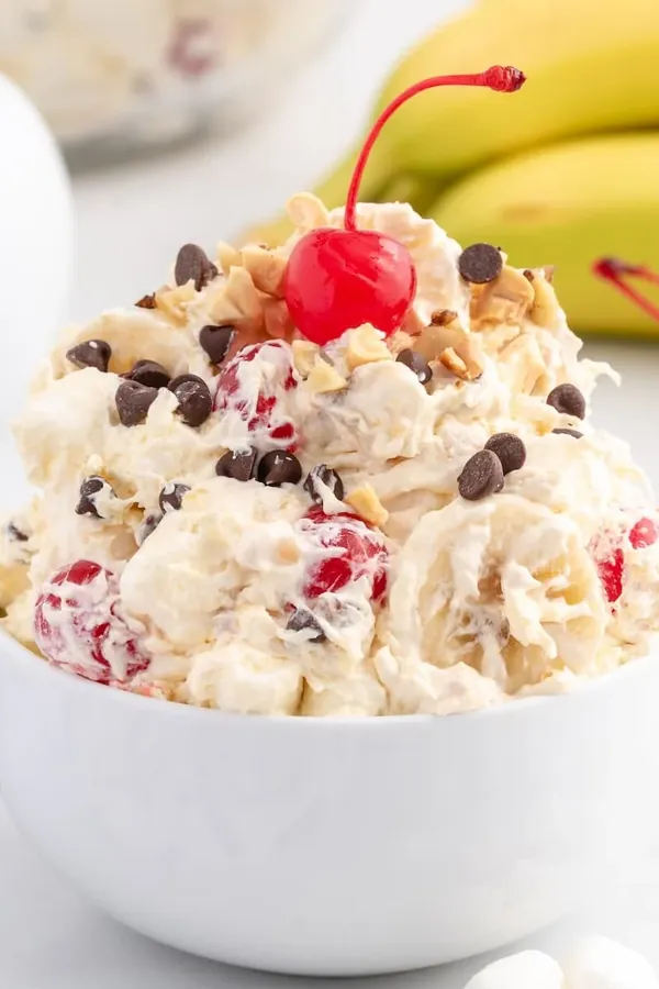 Banana Split Fluff brings the classic banana split flavor to a no-bake dessert salad.