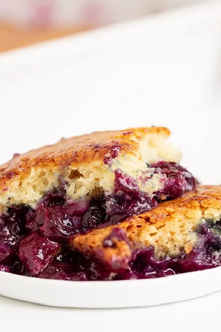 Blueberry Cobbler is a simple, comforting dessert with juicy blueberries under a fluffy cake-like topping.