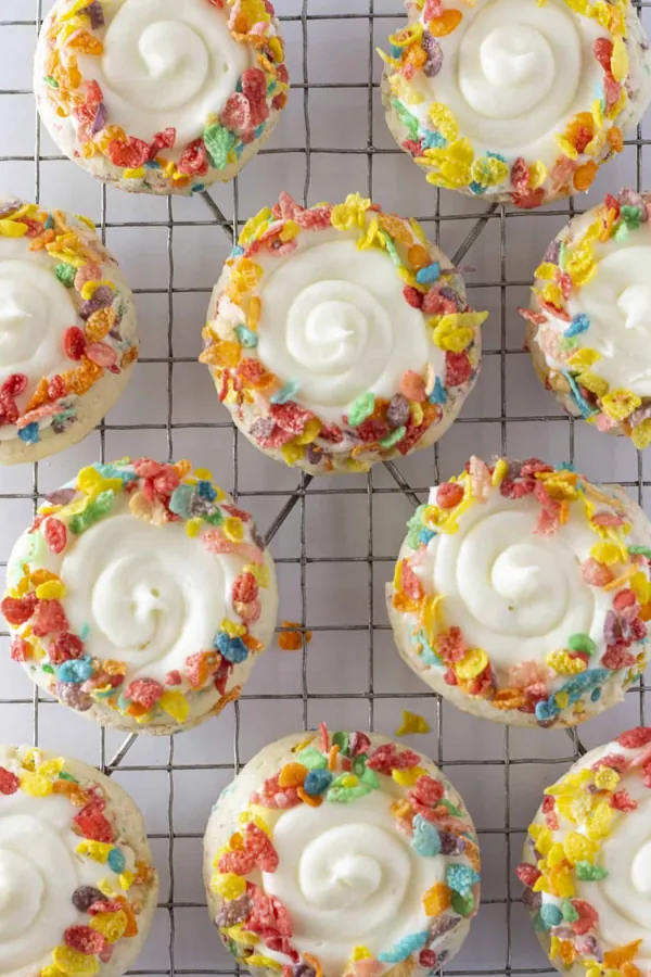 A cream cheese frosting and extra Fruity Pebbles on top make them extra special.