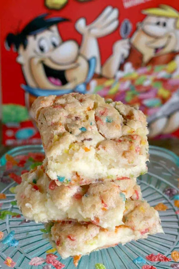 Fruity Pebbles Cookie Cheesecake Bars feature a chewy cookie base loaded with cereal and a creamy center.