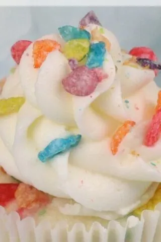 Fruity Pebbles Cupcakes are fun, easy, and full of colorful cereal bits throughout.