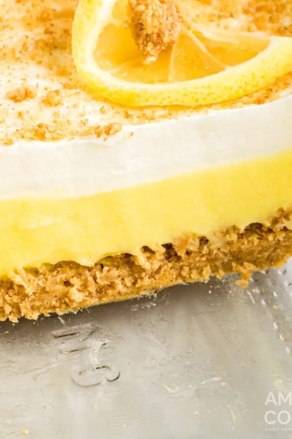 Lemon Cream Cheese Pudding Dessert brings together graham crackers, lemon pudding, cream cheese, and whipped topping.