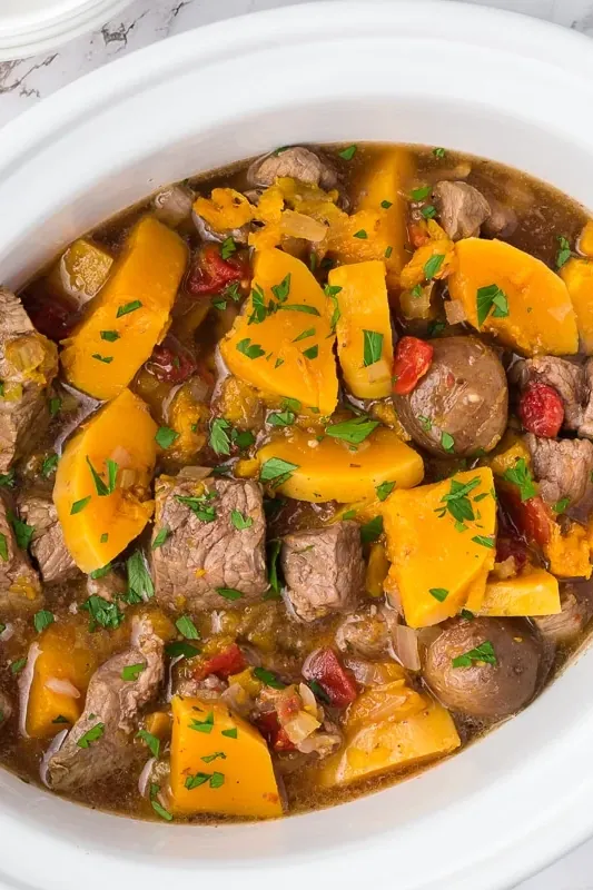 Butternut squash beef stew adds sweet, roasted squash to a classic beef stew base.