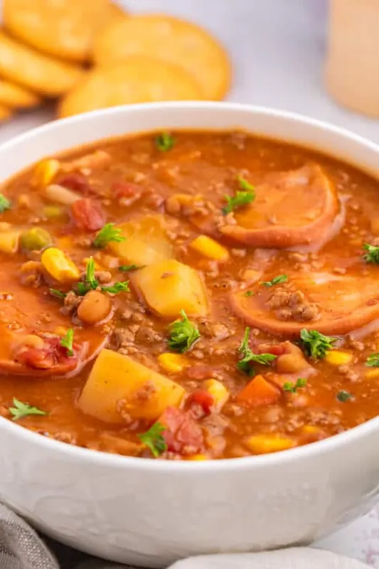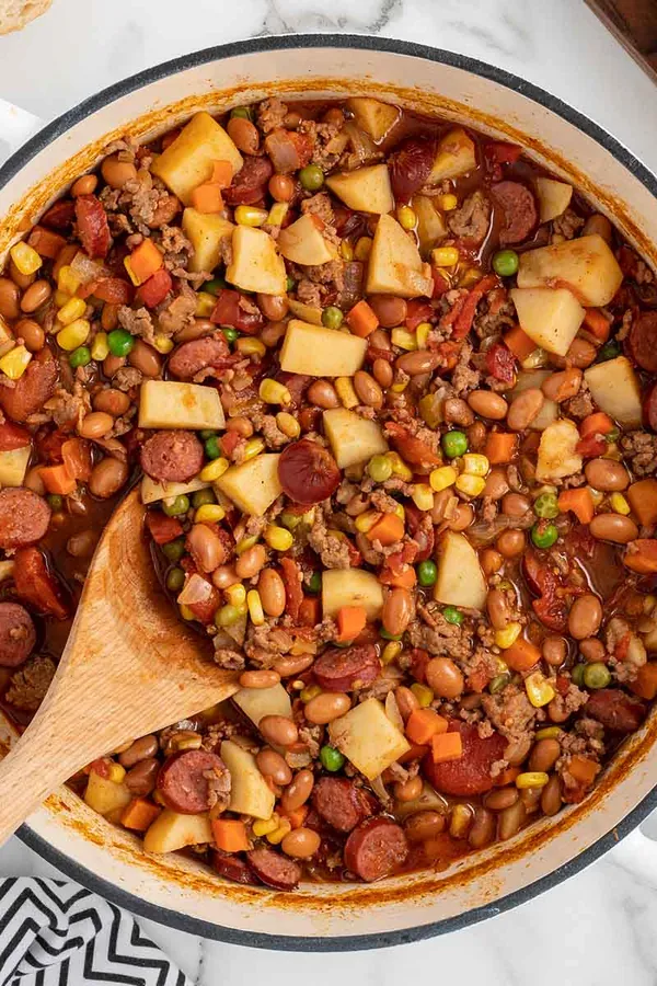 Cowboy Stew brings together ground beef, kielbasa, potatoes, and beans in a savory one-pot meal.