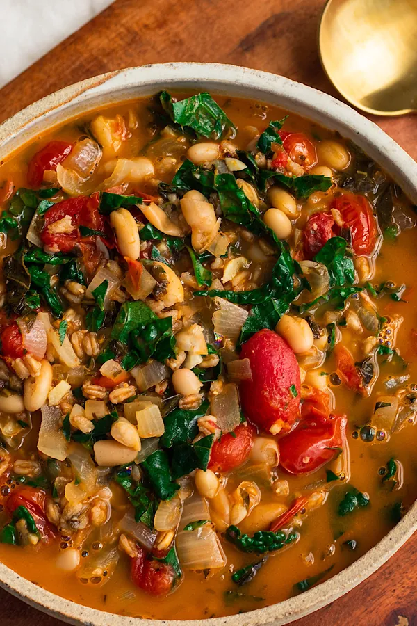 Roasted tomato and white bean stew with farro brings a rustic, satisfying taste to your table.