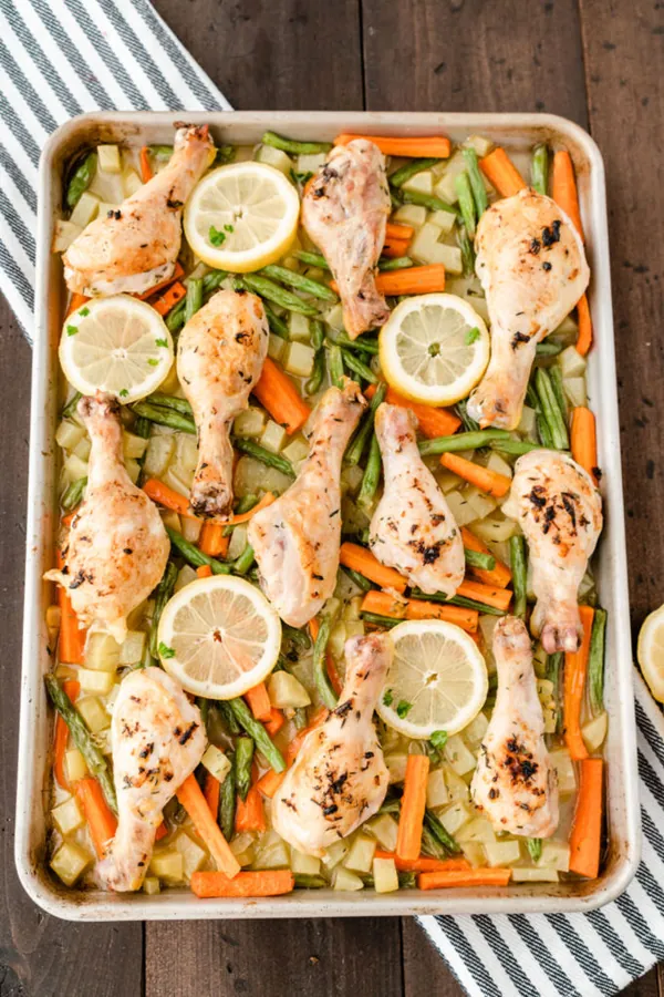 Carrots, potatoes, and green beans roast alongside for a full, simple meal.