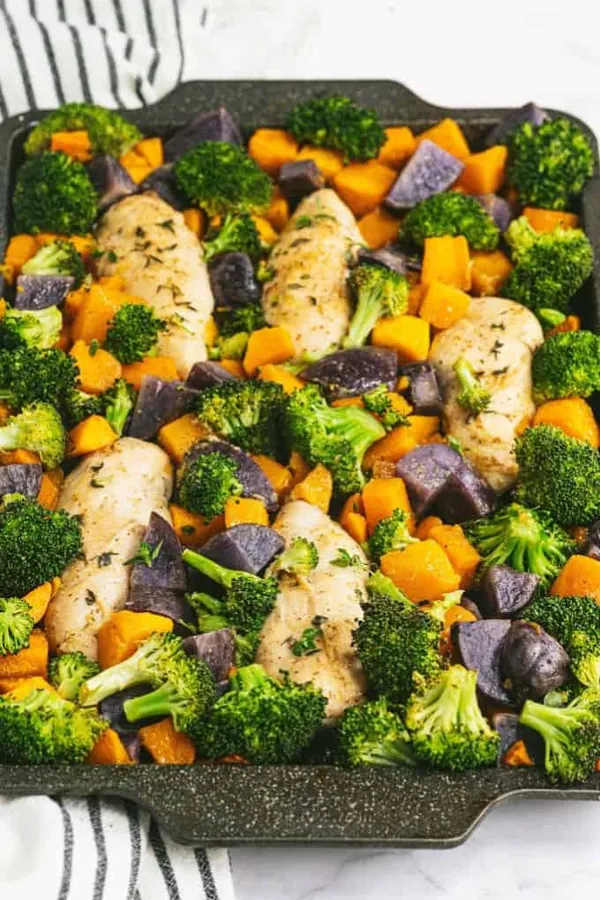 Roasted butternut squash, purple potatoes, and broccoli make it a colorful, satisfying weeknight meal.
