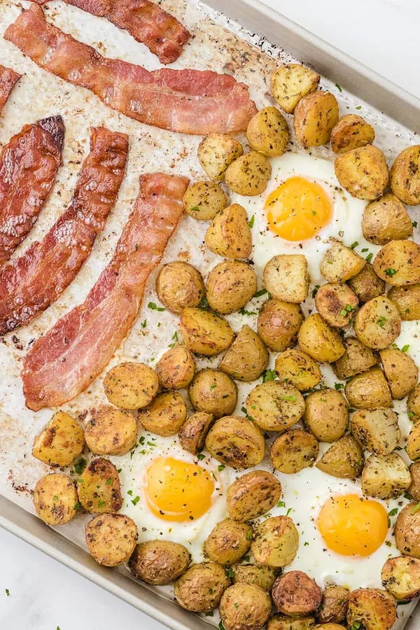 Sheet Pan Breakfast is a hearty start to your day with eggs, crispy bacon, and potatoes.