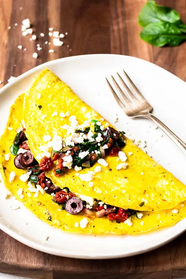 This Greek omelet is rich with sun-dried tomatoes, spinach, feta, and olives for a bold, savory bite.