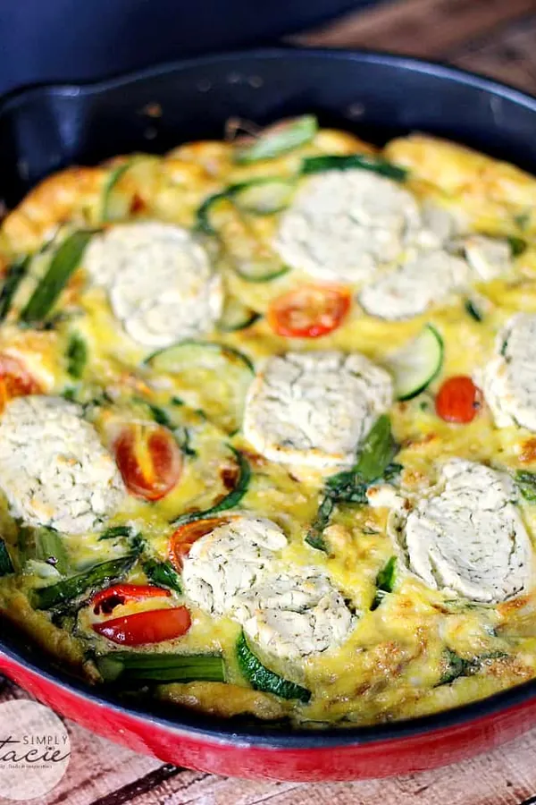 The Spring Vegetable & Goat Cheese Frittata is a fresh, colorful dish bursting with asparagus, zucchini, tomatoes, and creamy goat cheese.