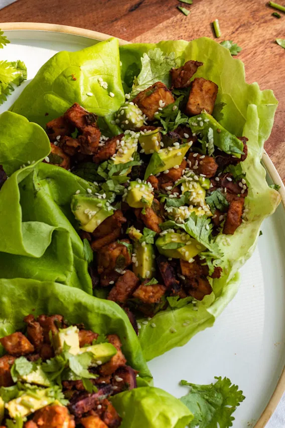 Buffalo Tempeh Carrot Lettuce Wraps are a high-protein, no-fuss vegan meal.